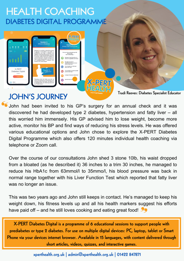 He had been invited to his GP’s surgery for an annual check and it was discovered he had developed type 2 diabetes, hypertension and fatty liver – all this worried him immensely. His GP advised him to lose weight, become more active, monitor his BP and find ways of reducing his stress levels. He also offered him various educational options and John chose to explore the X-PERT Diabetes Digital Programme which amongst other options offers 120 minutes individual health coaching via telephone or Zoom call.